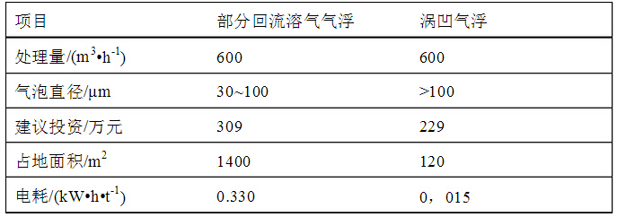 揚(yáng)子石化含硫改建擴(kuò)建工程竣工后,原污水場能力明顯不足,且原污水場界區(qū)內(nèi)已無擴(kuò)容場地,改造設(shè)施應(yīng)小型化。改造方案在部分回流溶氣氣浮和渦凹?xì)飧≈羞x擇,下表是2種方案的比較: