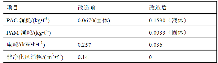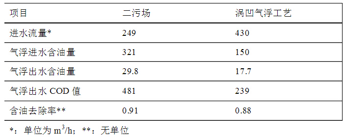 投入使用的渦凹?xì)飧C(jī)組運(yùn)行良好,設(shè)備振動及噪音很??;產(chǎn)生的氣泡均勻細(xì)密;出渣細(xì)密,分布均勻;出水清澈,無明顯油花。下表為改造前后生產(chǎn)運(yùn)行數(shù)據(jù)對比: