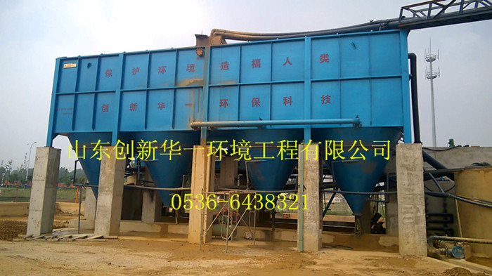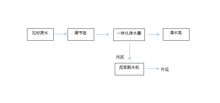 石材廢水中主要含有石粉(成分為SiO2、CaO和CaCO3等),少量金剛石細(xì)粒、磨料細(xì)粒以及沖洗泥砂等。相比磨機(jī)廢水,鋸機(jī)和切邊機(jī)兩種廢水的水質(zhì)更加相近,污水中顆粒更粗大且均含有少量的有機(jī)冷卻劑(主要為皂化物、太古油等)。通過調(diào)研和水質(zhì)分析可知,該廢水的特征污染物為懸浮物(SS),污水中顆粒呈懸浮和膠體狀態(tài),分散度高。為此,創(chuàng)新華一環(huán)保根據(jù)石材污水的上述特點(diǎn)專門研發(fā)的一體化凈水設(shè)備,經(jīng)過大量的實(shí)際運(yùn)行實(shí)驗(yàn),效果非常理想。污泥則用泥漿脫水機(jī)處理,形成泥餅,工藝流程如下: