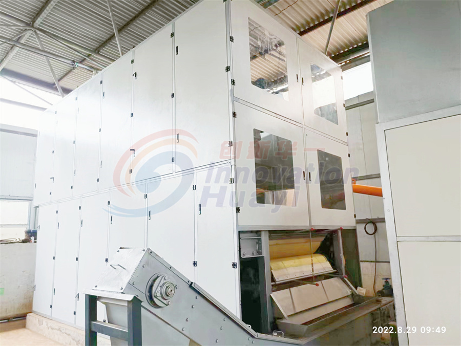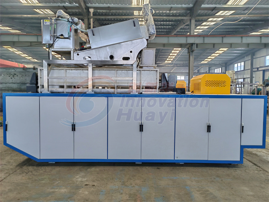 一體式高壓帶式污泥脫水機,可直接處理含水率98%的市政污泥,該設(shè)備濃縮段采用疊螺脫水機,處理后污泥含水率85%左右進(jìn)入雙螺旋混合器,污泥和破壁劑在雙螺旋混合器內(nèi)充分混合后進(jìn)入2級污泥布料器,經(jīng)過14根呈S型分布的高壓擠壓輥處理后,污泥含水率可以降至70%以下,也可通過添加少量石灰將含水率降至60%以下。