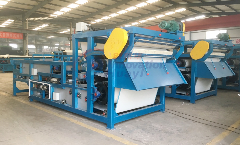 漿料經(jīng)布漿器均勻地分布在上網(wǎng)預(yù)脫水區(qū),后進(jìn)入重力脫水區(qū)。污泥在該區(qū)域內(nèi)主要靠自身的重力作用脫去大部分水份,使?jié){料失去流動性,脫水濃度提至3-5%。然后在中網(wǎng)上面繼續(xù)脫水,漿料進(jìn)入由中、下網(wǎng)形成的楔形交匯區(qū),即壓力脫水區(qū)。漿料在該區(qū)域受到中、下濾網(wǎng)的輕度擠壓,脫水至15-20%左右,然后進(jìn)入加壓脫水區(qū)。壓力脫水區(qū)由8個不同直徑的脫水輥,使濾網(wǎng)的兩面在擠壓過程中迅速脫水。脫水壓輥的直徑由大逐漸變小的排列及濾網(wǎng)包角的改變,確保形成不斷增大的脫水壓力及相應(yīng)的剪切力,使?jié){料在“S”形脫水區(qū)反復(fù)變形并不斷脫除水份濃度28-35%以上形成泥餅,然后由刮刀刮落。卸去漿料的濾網(wǎng)經(jīng)高壓水沖滌干凈后進(jìn)入下一個工作循環(huán)。