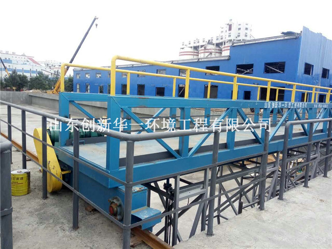 2、將設備吊至平流池上,四個行走輪安放于鋼軌上,按基準線找平,校核安裝尺寸。